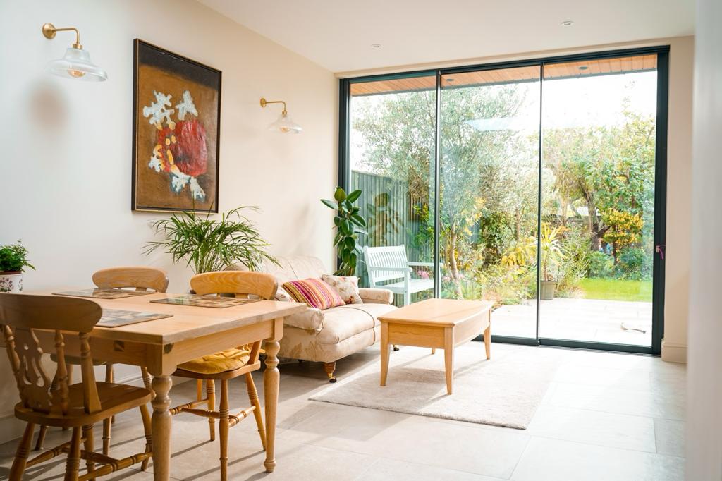 One of the property's highlights is the large rear kitchen diner that boasts a flush patio garden that steps down, creating a seamless indoor-outdoor experience. The kitchen is flooded with natural light, thanks to the large 8-metre sliding doors and three large skylights that provide ample daylight throughout the day. The oak herringbone floor adds an elegant touch to the space, creating a warm and inviting atmosphere.